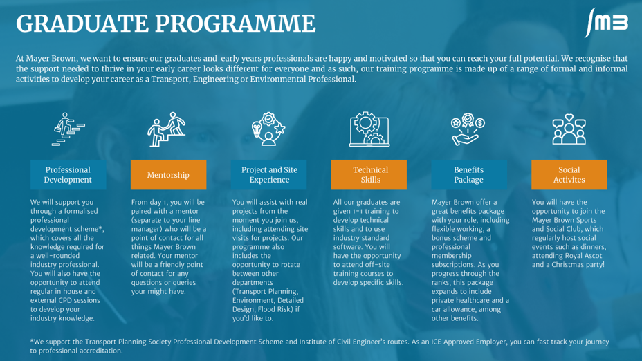 Early-years professionals are critical to the future success of our business. We provide a structured graduate programme supported by accredited in-house trainers and experienced mentors, for both infrastructure design engineers and transport planners. The programme is run in conjunction with the Institute of Civil Engineers (ICE) and the Transport Planning Society (TPS) respectively.